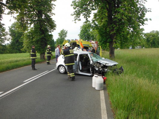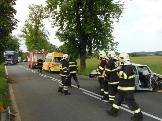 Jednotka vyjela na žádost KOPIS na dopravní nehodu jednoho OA, které narazilo do stromu u silnice cca 100m za hranicí obce Olešná ve směru na Bonětice. Po příjezdu na místo události byl řidič havarovaného vozidla při vědomí, stěžoval si na bolest hlavy a hrudníku, měl vyditelné poranění na hlavě a ruce. Řidiči jsme nasadili krční límec a kontrolovali jeho stav do příjezdu záchranné služby, která si jej převzala do péče. Řidič nebyl ve vozidle zaklíněn. Dále jsme zasypali sorbentem unikající provozní kapaliny z havarovaného vozu a provedli odpojení baterie vozu.